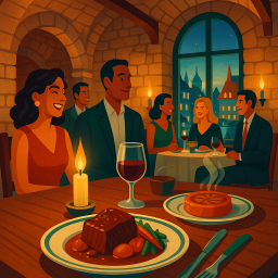 Fabulous evening. Cozy decor, brick walls, flowers on tables, in a converted factory building. About 10-minute cab ride from the Old City gates. Service is first rate: the staff is courteous, prompt, and helpful. You don't order from a menu