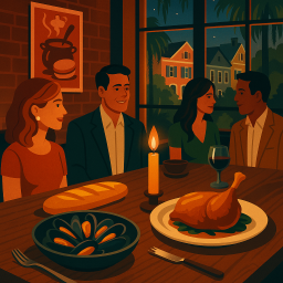* Peter can now enjoy the dinner with his friends at Chez Nous Charleston!
